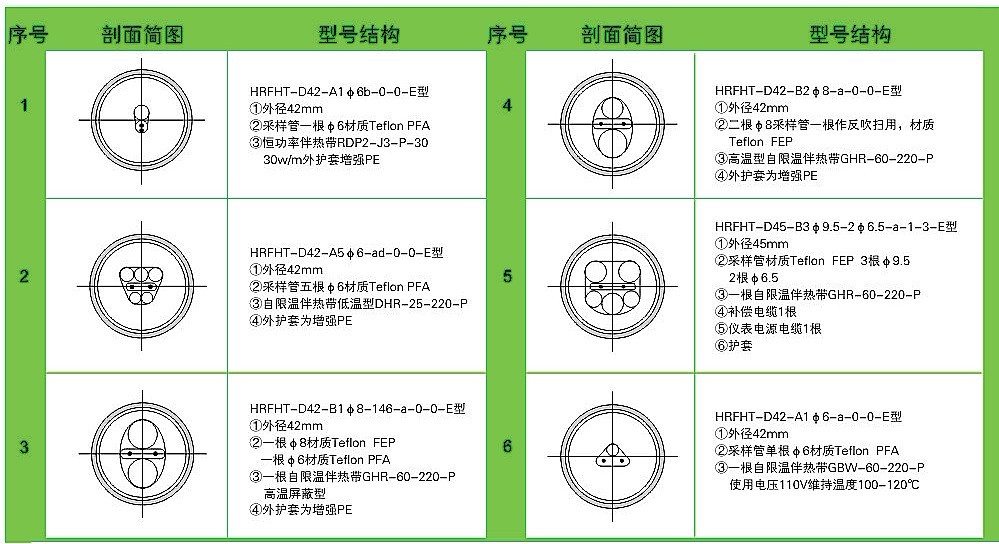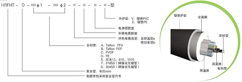 耐腐采樣伴熱復合管是環(huán)保監(jiān)測系統(tǒng)中的重要部件,它是由一組耐腐高性能樹脂導管輔以自限溫伴熱帶以及補償線纜組成內(nèi)芯,外加保溫層,最后敷以阻燃聚乙烯(PE)保護外套復合而成。自限溫伴熱帶的自動限溫功能,可以保證采樣管內(nèi)維持一定的溫度,從而盡可能保證采集樣品與初始值保持一致,最終確保環(huán)保監(jiān)測系統(tǒng)連續(xù)、正確地采集樣氣。根據(jù)采集樣氣的成份、溫度等實際情況,耐腐伴熱采樣復合管中采樣導管可以選用不同的材質,如PFA(四氟乙烯與全氟烷基醚共聚物)、FEP(四氟乙烯和六氟丙烯共聚物)、PVDF(聚偏二氟乙烯)、PE(阻燃聚乙烯)、尼龍610等等, 伴熱帶可以選用中、低、高溫度伴熱帶,另外還可以根據(jù)用戶要求添加補償導線、電源線等 。
