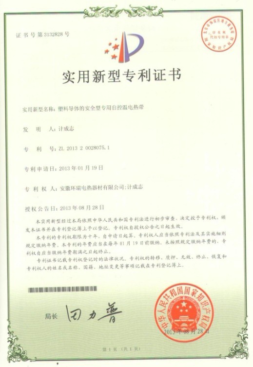 環(huán)瑞自成立研發(fā)小組至科學(xué)技術(shù)中心期間,通過獨(dú)立開發(fā),與合肥工業(yè)大學(xué)建立長期合作關(guān)系,聘請相關(guān)專業(yè)的技術(shù)專家等模式,投入大量的人力物力。我司以安全,實(shí)用性能為目標(biāo),對電伴熱帶結(jié)構(gòu)、原材料、生產(chǎn)工藝進(jìn)行創(chuàng)新,最新研發(fā)的“三層共擠自控溫電伴熱帶”“ 塑料導(dǎo)體的安全型自控溫電熱帶”獲得了2項(xiàng)國家專利證書。我司已獲得了5項(xiàng)關(guān)于自限溫伴熱帶的國家專利證書,我司伴熱帶的生產(chǎn)技術(shù)已達(dá)到國內(nèi)先進(jìn)。共計19項(xiàng)專利。新的專利證書已下達(dá)。