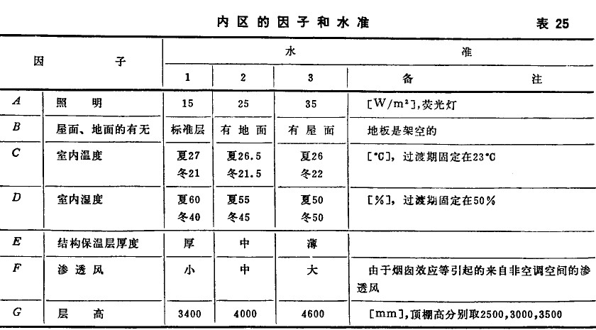 在表11中給出全年負(fù)荷計算方法的種類。在略算法中,根據(jù)實驗設(shè)計法利用推斷表的方法,是在對負(fù)荷的大小有影響的因素(例如窗面積比)的幾個水準(zhǔn)(例如20%, 40%,60%三個水準(zhǔn))中選出一個,只要用簡單的加減運(yùn)算便可求出負(fù)荷某種程度的增加或減少,因而是非常便利的。這里給出的是由日本建筑學(xué)會節(jié)能小委員會作成的表。