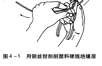 芯線截面為4mm,及以下的塑料硬線,其絕緣層用鋼絲鉗剖削,具體操作方法:根據(jù)所需線頭長度,用鉗頭刀口輕切絕緣層(不可切傷芯線),然后用右手握住鉗頭用力向外勒去絕緣層,同時左手握緊導線反向用力配合動作,如圖4-1所示。