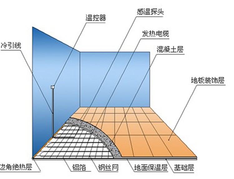 發(fā)熱電纜采暖系統(tǒng)由發(fā)熱電纜和溫控器兩部分組成,發(fā)熱電纜鋪設(shè)于地面中,溫控器安裝于墻面上。當(dāng)室內(nèi)環(huán)境溫度或地面溫度低于溫控器設(shè)定的溫度時,溫控器接通電源,發(fā)熱電纜通電后開始發(fā)熱升溫,發(fā)出的熱量被覆蓋著的水泥層吸收,然后均勻地加熱室內(nèi)空氣,還有一部分熱量以遠(yuǎn)紅外輻射的方式直接釋放到室內(nèi)。該種方式的采暖系統(tǒng)把整個地面作為散熱器,室內(nèi)溫度上層低而下層高,有溫足而頂涼的感受,使您感到舒適而自然。