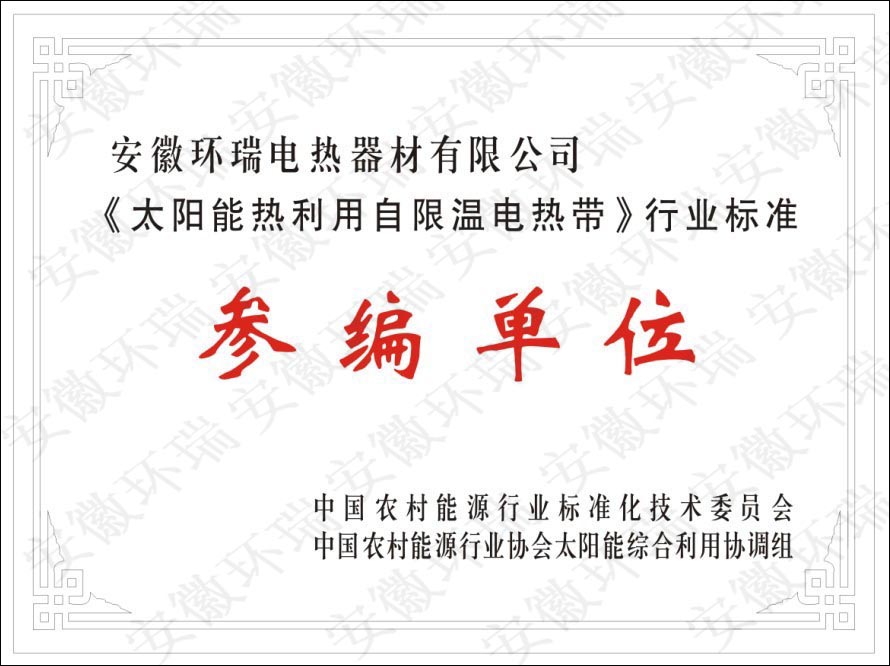 安徽環(huán)瑞電熱器材有限公司長期致力于自限溫電伴熱帶在各行業(yè)的應(yīng)用,尤其是太陽能專用自限溫電伴熱帶,并研發(fā)出一種安全節(jié)能的太陽能電伴熱帶-納米阻燃本質(zhì)安全型電熱帶,獲得了國家專利證書和省高新技術(shù)產(chǎn)品,針對目前國內(nèi)層次不齊的電熱帶質(zhì)量,為了規(guī)范太陽能電熱帶的市場,提高產(chǎn)品的質(zhì)量。安徽環(huán)瑞與多家伴熱同行企業(yè)共同起草《太陽能熱利用自限溫電熱帶》,此標(biāo)準(zhǔn)由中國農(nóng)村能源行業(yè)協(xié)會提出。能源行業(yè)農(nóng)村能源標(biāo)準(zhǔn)化技術(shù)委員會歸口,是專門針對太陽能行業(yè)的自限溫電熱帶標(biāo)準(zhǔn),具有重要意義。